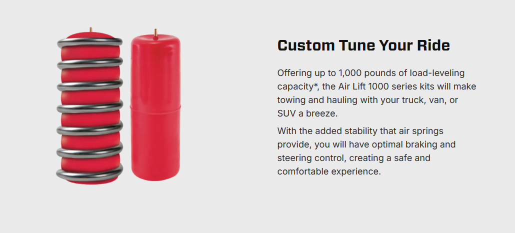 The AirLift 1000 is an adjustable air helper spring engineered for coil spring suspensions, front or rear. Custom tune the ride you want, whether you’re hauling, towing, or riding light!.