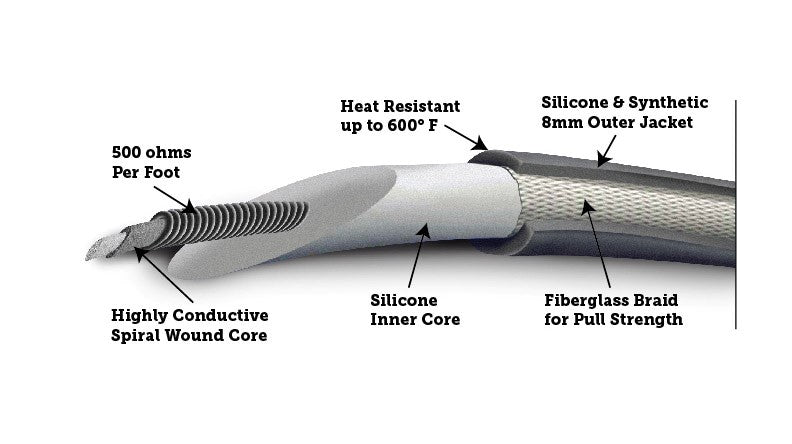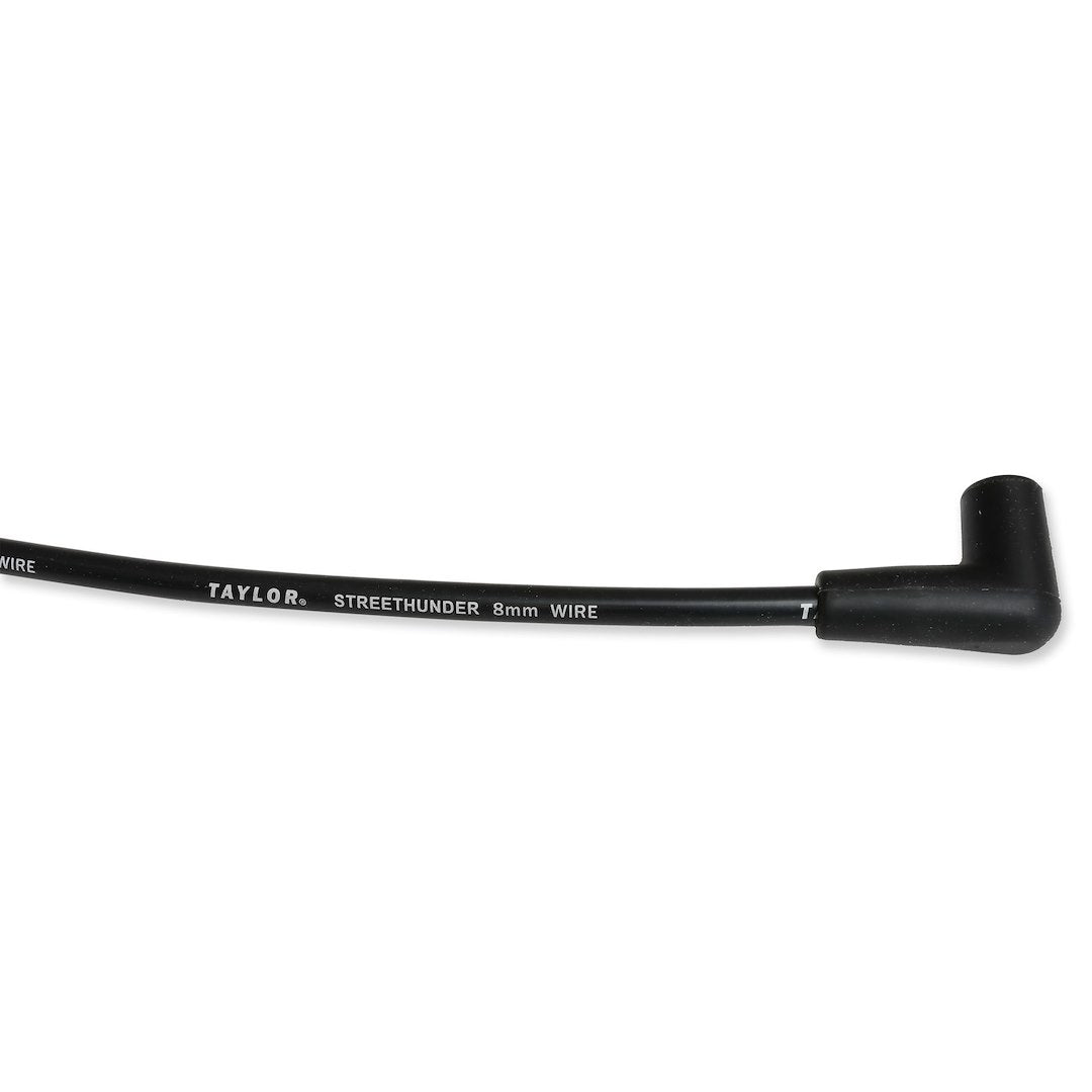 Taylor's 8 Millimeter StreeThunder Wire delivers great performance at an extremely affordable price. It features a 500-Ohm per foot resistance Kevlar helically Spiro wound core conductor for greater strength and durability that suppresses Electro Magnetic (EMI) and Radio Frequency Interference (RFI). Wrapped in durable Synthetic silicone double layer jacketing that resists heat, oil and abrasion. Delivers greater spark energy while improving power, idle and fuel efficiency. Works in conjunction with most ignition systems, on board computers and electronic components. Matching black silicone boots protect against high exhaust temperatures. Double locking spring terminals for secure vibration proof connections.