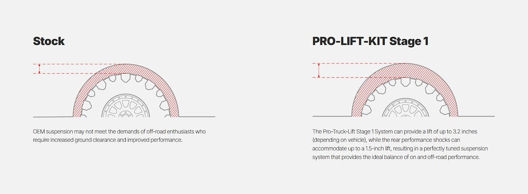 Eibach's PRO-TRUCK-LIFT STAGE 1 combines our lift springs and sport shocks with height adjustable clips for increased tire clearance and improved on-and-off road performance. For over seven decades, Eibach has been a reputable name in the automotive industry, specializing in the design and production of high-performance suspension systems and components for various vehicles including cars, trucks, SUVs, UTVs, motorcycles, and motorsports applications. Our offerings features springs, shock absorbers, sway bars, and coilovers, providing a comprehensive range of products to enhance the handling and ride comfort of vehicles. Our uncompromising commitment to quality, innovation, and customer satisfaction has established us as a preferred choice among performance enthusiasts worldwide.