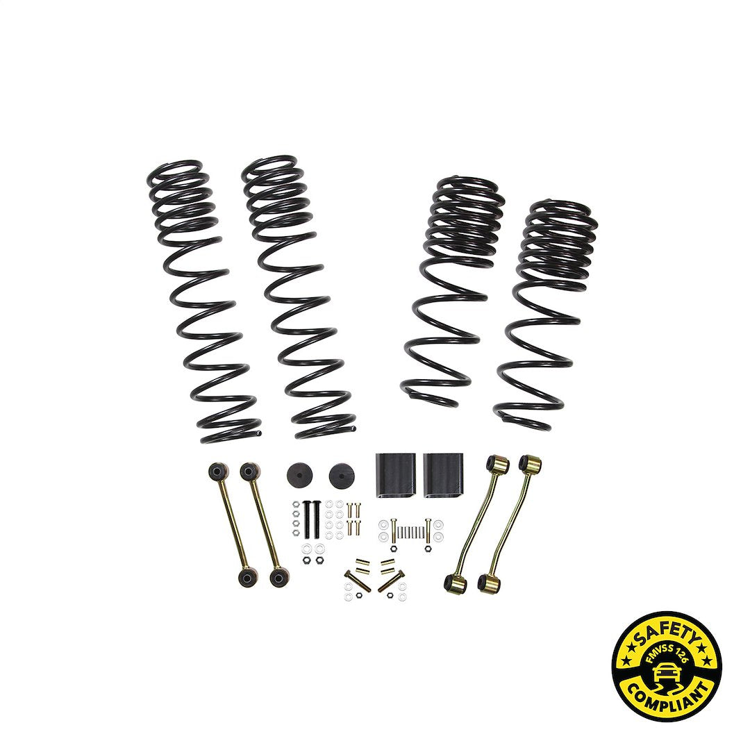 Skyjacker specifically engineered a progressive variable rate coil spring, distinctively a 2-stage dual rate long travel coil. Spring rate progression is from a 1st Flex Rate to a 2nd Ride Rate. The 1st Flex Rate stage delivers a comfortable ride with the ability to flex for increased articulation. The flex rate expands during full articulation as the suspension drops (full droop). This keeps the coil springs seated in the upper coil mount/bucket and the tires in contact with the terrain. The 2nd Ride Rate stage only engages after compression past the flex rate. Engineered to coordinate with the Wrangler’s distinctive suspension handling characteristics, the rear coils are side specific. Front and Rear Bump Stop Spacers bolt onto the axle bump pads and keep the suspension travel safely in check. Front and Rear Extended Length Sway Bar End Links allow full articulation as the suspension drops (full droop). These sway bar end links features Skyjacker installed pressed-in HD OEM style rubber bushings. Proper suspension geometry ensures the Electronic Stability Control (ESC) system functions within factory parameters.