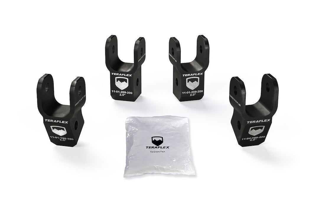 2 Inch Shock Extension Brackets to optimize extended and collapsed lengths of factory length shock absorbers on JL Wrangler/Unlimited models with a 2 to 2.5 Inch lift. A must to restore proper handling and performance on your lifted rig. Perfect for those on a budget. These simple Shock Extension Brackets bolt to the stock shocks to extend their effective length.