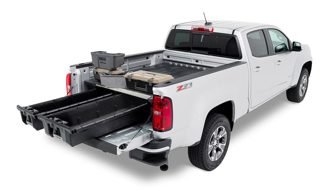 DECKED truck bed storage drawers provide the ultimate access and organization for your tools and gear. Customize your truck and keep your gear organized, weatherproof and secure while maintaining full bed use. DECKED DIY tool box is durable with a 2000 Pound payload and 200 Pound per drawer rating. 100 Percent American Made. Your truck isn't a man purse. It hauls heavy stuff like cement, plywood, recently dispatched ungulates, ATV and Moto's, your mother-in-laws new freezer fridge. We made DECKED so you can stack 2000 Pound of big stuff on the deck and still have access to smooth rolling drawers no matter what you've loaded up top. DECKED is weatherproof. Anything falling from the sky can’t get into your drawers. Period. DECKED protects your tools and gear from everything from a harmless little sprinkle or a torrential Act of God. They're not Tupperwear-tight; airborne particulate like dust or mist can make it's way in.