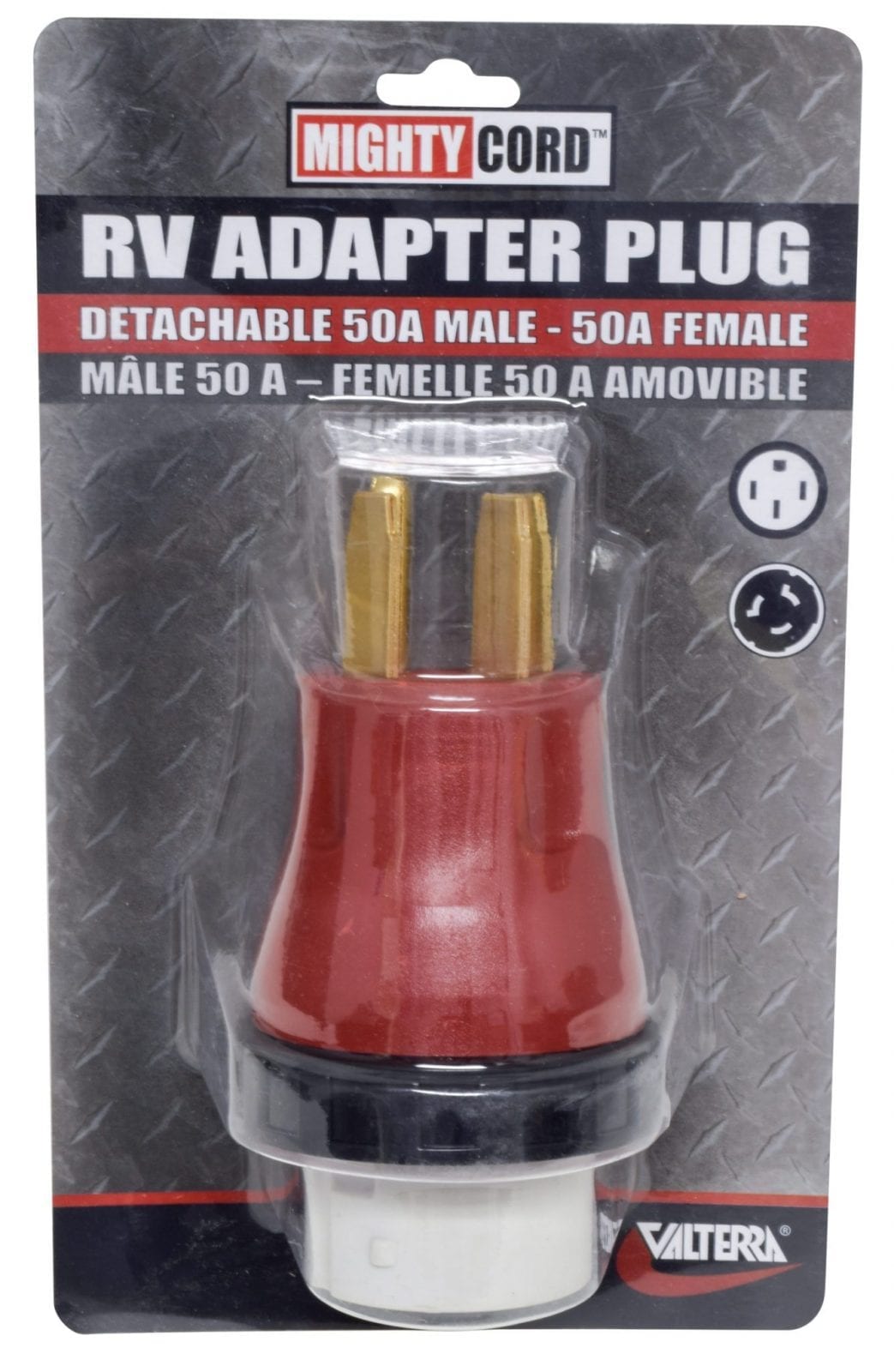 Detachable RV adapter plug for use in adapting 50 Ampere power for use with 50 Ampere trailers. Detachable female receptacle with ring makes hooking up the RV to campground power easy and convenient
