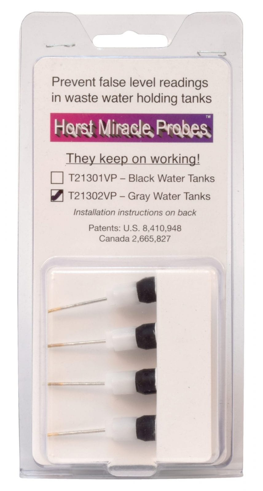 Sludge and soap residue build-up on the sides of RV black and gray water tanks can lead to false readings. The sludge acts like a conductor between the positive content level sensors down the tank to the negative probe that is located at the bottom of the tank. This will trigger the indicator panel to show that there is liquid level in the tank even when there is none. The patented design of Horst Miracle Probes prevents similar false readings in the following ways: Horst Miracle Probes are considerably longer than standard probes and the sensor is surrounded by a Delrin body and teflon tube which prevents any liquid residue or sludge from setting up a conductive path.
