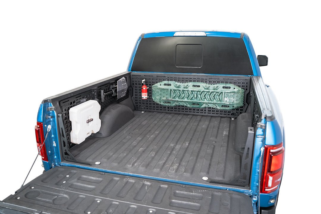Ford F-150 and 2nd Gen Raptor Bed Side Molle Panels provide the ultimate cargo solution. Engineered for off-road durability and keeping your gear secure, these storage panels are compatible with various attachment systems. You can secure your gear to these panels with molle mounts, straps, bolts, or even zip ties if you’re in a pinch. Choose from several configurations for either the driver and/or passenger sides to maximize your vertical storage, without sacrificing your bed cargo space. Constructed from American steel and finished in a durable 2-stage hammer black powder coat, these storage panels add secure storage for essentials like shovels, hi-lift jacks, fluid tanks, recovery gear, and more. The durable coating protects against rust and weather, ensuring the panels withstand even the most challenging tasks. Rigid when mounted yet easily removable, the panels let you adapt your storage as needed. Our panels were carefully designed to perfectly fit the contours of your Ford truck bed while maximizing available square footage for storage. As always, these are fully bolt-on and Made in America.