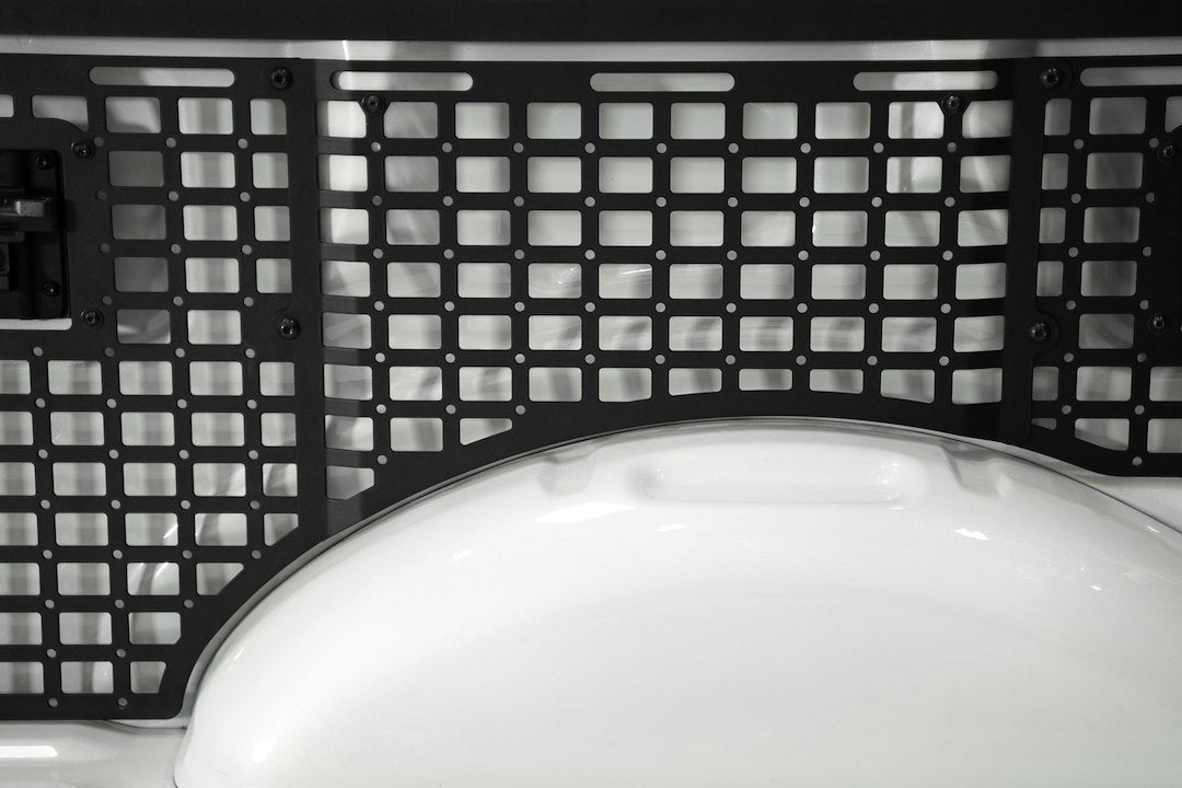 2021+ Ford F-150 and 3rd Gen Raptor Bed Side Molle Panels optimize the cargo storage capabilities of your truck bed. Engineered for off-road durability and keeping your gear secure, these storage panels are compatible with various attachment systems. You can secure your gear to these panels with molle mounts, straps, bolts, or tie-down straps. Choose from several configurations for the driver side, passenger side, or both sides to maximize your vertical storage - and leave the bed floor clear for larger cargo. Our panels are unrivaled in their fitment, as the very closely follow the contours of the truck bed. Constructed from American steel and finished in a durable 2-stage hammer black powder coat, these F-150 molle panels add secure storage for essentials like shovels, hi-lift jacks, fluid tanks, recovery gear, and more. The panels mount to the bed at several points, ensuring rigidity on rough terrain. Even so, they are easily removable when needed. As always, these are fully bolt-on and Made in America.