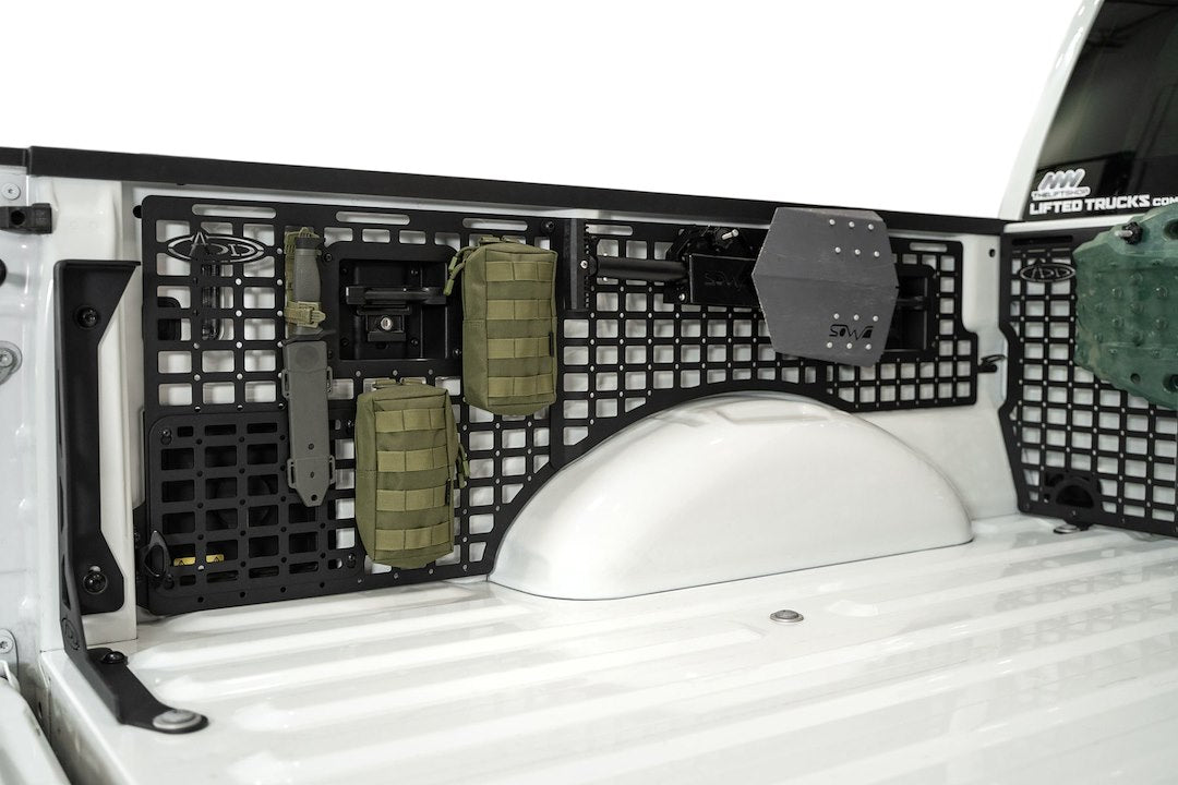 2021+ Ford F-150 and 3rd Gen Raptor Bed Side Molle Panels optimize the cargo storage capabilities of your truck bed. Engineered for off-road durability and keeping your gear secure, these storage panels are compatible with various attachment systems. You can secure your gear to these panels with molle mounts, straps, bolts, or tie-down straps. Choose from several configurations for the driver side, passenger side, or both sides to maximize your vertical storage - and leave the bed floor clear for larger cargo. Our panels are unrivaled in their fitment, as the very closely follow the contours of the truck bed. Constructed from American steel and finished in a durable 2-stage hammer black powder coat, these F-150 molle panels add secure storage for essentials like shovels, hi-lift jacks, fluid tanks, recovery gear, and more. The panels mount to the bed at several points, ensuring rigidity on rough terrain. Even so, they are easily removable when needed. As always, these are fully bolt-on and Made in America.