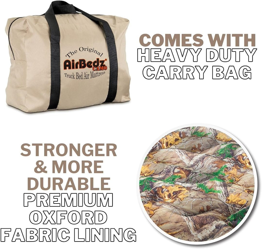 High Quality AirBedz Mattresses are designed to fit around and over the wheel wells of your pick-up creating a sleep area that utilizes the entire truck bed, providing more room and comfort for outdoor enthusiasts. Heavy-duty construction to ensure product durability mattress meeting the extreme outdoors-men's needs. Where playing hard and sleeping well are all that matter. Optional inflatable Wheel Well Inserts transform AirBedz® into a standard air mattress great for both home and tent use. The AirBedz Original Truck Bed Air Mattress offers a comfortable and fast solution to truck-bed camping. Perfect for outdoor trips and events, the AirBedz Original Truck Bed Air Mattress offers convenience and quality for a good night's sleep.