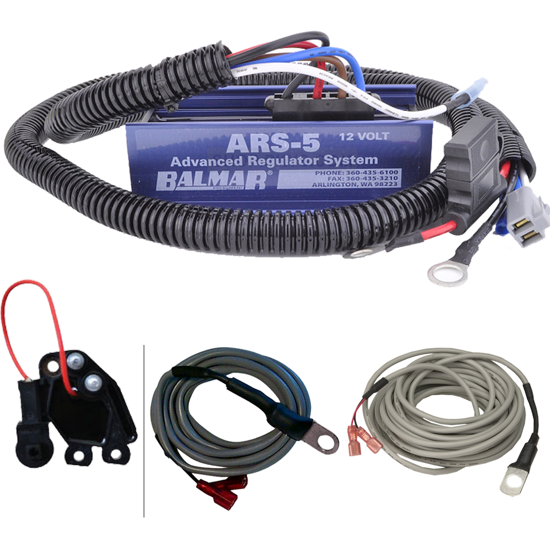 Balmar ARS-5 Regulator High output alternators are an important part of your system for battery care, but they are definitely not the only part.Without proper voltage regulation, battery charging can be a slow process, or even worse, an ideal recipe for early battery failure. All commercial alternators come with an internal rectifier/regulator circuit that: (1) Converts AC current generated by the alternator to DC current, and (2) Fixes the voltage output to a static level -- typically 14.6 volts. There are several deficiencies with internal regulators: (1) Not all battery technologies want to receive 14.6 volts. (2) All battery types have an optimal charging "profile", which means they want different voltages and currents at different stages of their charging cycle, as well as variations when battery temperatures change. (3) Once fully charged, batteries can overheat if they are supplied with continuous current at a fixed charge voltage. Balmar's patented ARS-5 Voltage Regulators provide a dynamic method for monitoring battery condition and apply the correct level of alternator control (voltage and current) to ensure that your batteries are charged quickly and safely. During engine operation, Balmar regulators progress through the following stages to ensure proper battery charging: Stage 1: Start Delay: After engine startup, the regulator waits for several seconds before applying field current to the alternator. This allows the engine and belts an opportunity to warm up before the alternator load is applied. Stage 2: Soft Ramp: The regulator slowly increases field excitation of the alternator to reduce belt stress. Stage 3: Bulk Charging: The regulator increases field output to the maximum safe level, allowing the alternator to reach maximum amperage output based on the target limits of the battery type being charged. Target voltage ranges from 14.1V to 14.6V depending on the battery type selected (24V bulk charging voltages range from 28.2V to 29.2V).