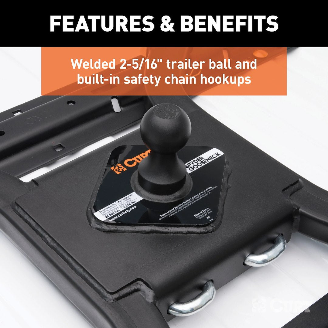 Just because you install 5th wheel brackets and rails in your truck bed does not mean your truck is limited to one type of towing. To give your truck the tools it needs to be the ultimate towing machine, CURT offers a gooseneck adapter for a 5th wheel setup. A 5th wheel or gooseneck plate is essentially a gooseneck hitch that mounts into a set of 5th wheel rails just like a 5th wheel trailer hitch. This allows you to pull both 5th wheel trailers and gooseneck trailers with the same pickup truck. CURT 5th wheel gooseneck hitches feature four pin-and-clip attachment points for a solid installation and quick removal when necessary, giving you full access and full use of your truck bed for hauling other loads. Best of all, our gooseneck adapter plates mount onto all industry standard rails. This particular gooseneck plate, the Spyder gooseneck, features an impressive gross trailer weight capacity of 25,000 Pounds, a tongue weight capacity of 6,250 Pounds and offers a 2-5/16 Inch trailer ball for pulling most types of gooseneck trailers, including livestock trailers, chopper boxes, gravity boxes, industrial equipment haulers, flatbeds and more. CURT 5th wheel gooseneck plates and gooseneck 5th wheel adapters are the ultimate versatility tools in heavy-duty towing. We coat our 5th wheel gooseneck hitches in a black carbide powder coat to ensure that they are highly resistant to rust, scratching and UV damage.