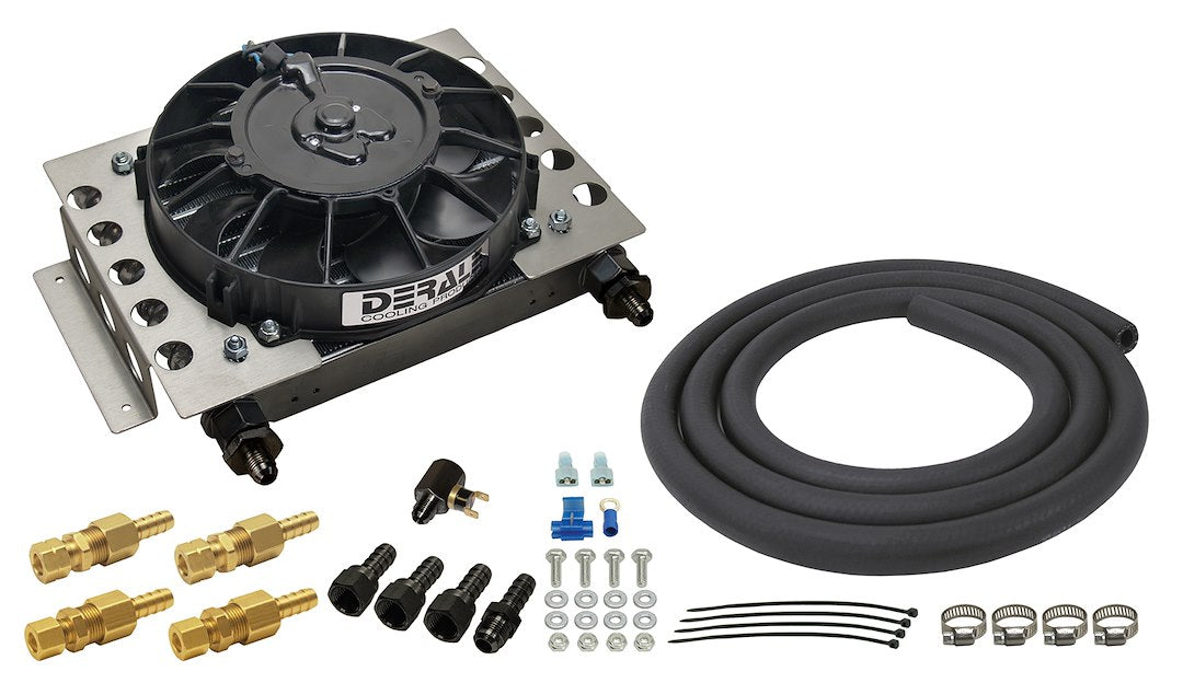 A step up from tube and fin type coolers, this popular remote cooler can literally be mounted almost anywhere, making it a popular addition for performance cars, hot rods, muscle cars and trucks. A heavy duty plate and fin cooler coupled with a Tornado fan and aluminum brackets, this kit comes with a complete installation kit to install easily on all vehicles with 5/16 Inch or 3/8 Inch transmission cooler lines. Also included is an 180 Degree Fahrenheit in-line thermostat for activating the electric fan. The Atomic Cool is designed for heavy duty towing and hauling, and can add years to the life of your transmission