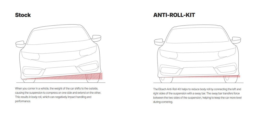 Complete your suspension upgrade with an Eibach Anti-Roll-Kit. While our Pro-Kit and Sportline spring sets are regarded as the primary suspension enhancement components, the Eibach Anti-Roll-Kit allows critical fine tuning of your car’s handling characteristics, our Anti-Roll-Kits reduce body roll through increased design stiffness over stock bars. The result: Increased handling and cornering grip in any performance driving situation. Manufactured from cold formed, high strength aircraft grade steel for precision performance, and finished with a long lasting red powder coat finish, "the Anti-Roll-Kit comes complete with all mounting hardware and instructions for easy installation."