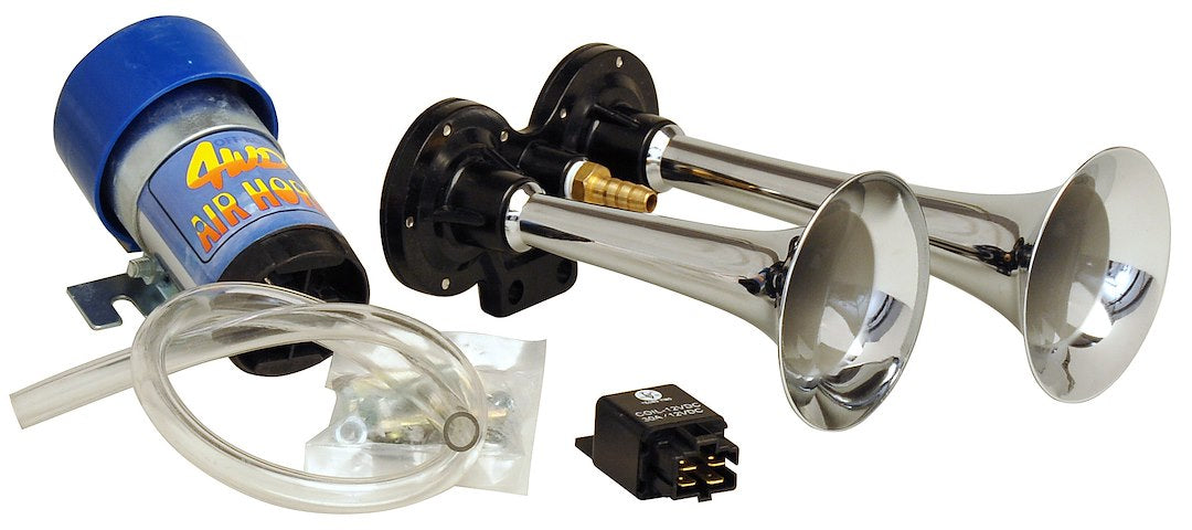 Our Direct Drive air horn sets are a great, simple upgrade for a factory horn. They come as a complete kit, ready for an easy install with a direct drive compressor, mounting hardware, and relay. The chrome plated metal trumpets will not crack or break like lesser products with thin plastic trumpets. They are also great for use with car alarms or motorcycles.