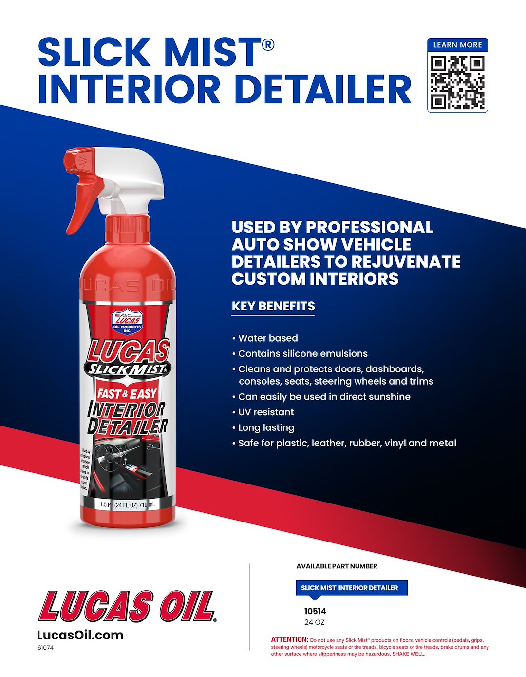 Lucas Slick Mist Interior Detailer is a spray treatment exclusively formulated by Lucas Oil Products designed to clean and protect like nothing you’ve ever used. Spray as needed onto interior surfaces such as plastic, vinyl, leather, rubber and metal for a “like-new” look. Cleans and protects, dashboards, consoles, doors and trim. Also works great on household furniture.