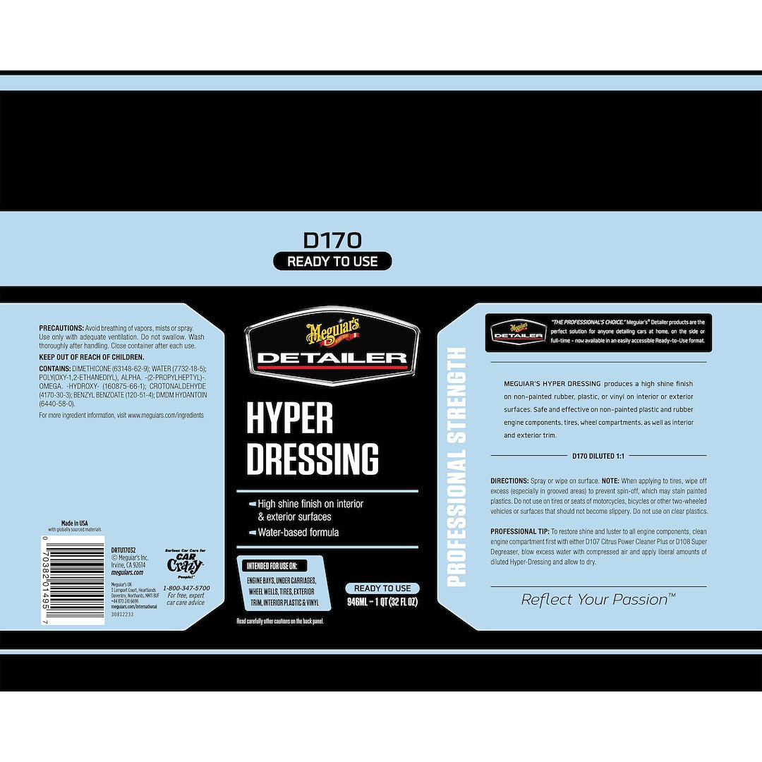 Meguiar’s Hyper Dressing produces a high shine finish on non-painted rubber, plastic, or vinyl on interior or exterior surfaces. Safe and effective on non-painted plastic and rubber engine components, tires, wheel compartment, as well as interior and exterior trim. “The Professional’s Choice” Meguiar’s Detailer products are the perfect solution for anyone detailing cars at home, on the side or full time: now available in an easily accessible Ready to Use format.