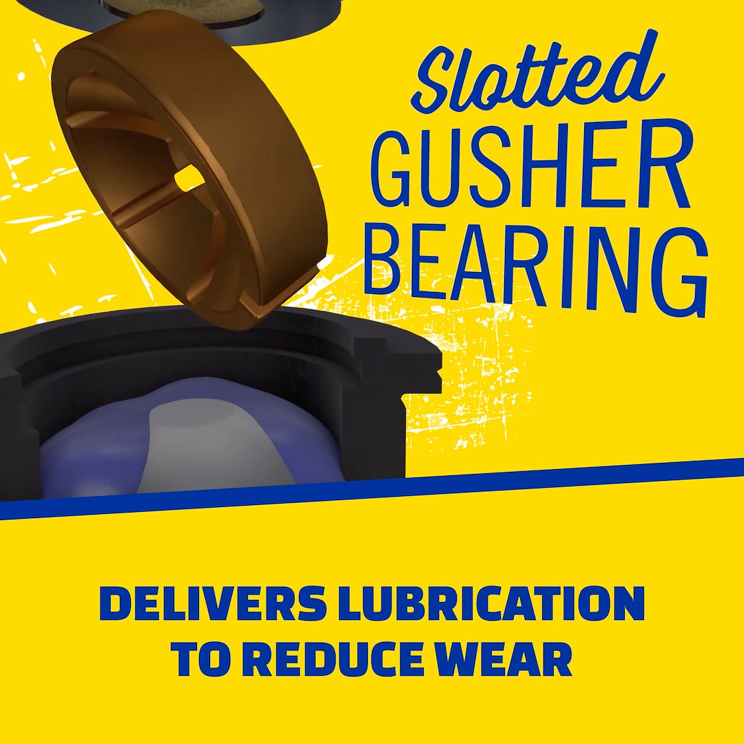 - Powdered Metal Gusher Bearing Design Enables Grease To Flow Through The Bearing To The Stud For Reduced Friction And Enhanced Strength And Stability