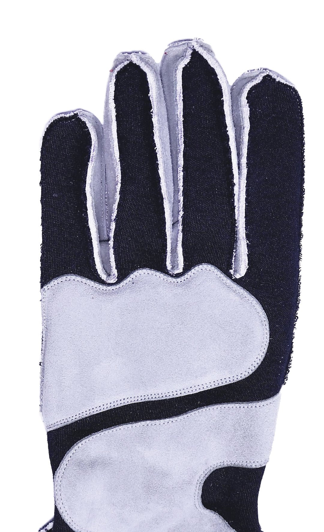 The RaceQuip 356 Series double layer out seam gloves are constructed with two layers of knit Nomex® and exceeds the SFI 3.3/5 rating. The out seam or reverse seam as they are sometimes called have the seam on the outside for improved comfort and better feel on the wheel. These are the same style of glove that you typically see worn in the top levels like NASCAR, Indy Car, IMSA and others. The palms are a high grip, supple suede leather which also improves comfort and feel. An extra long cuffed gauntlet provides extra fire protection. Mitered fingers offer a more precise fit again increasing comfort and feel.