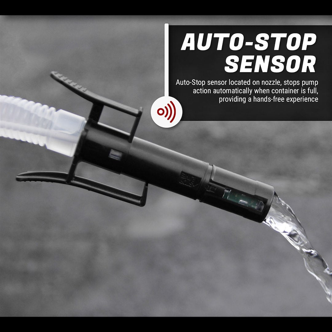 Our flexible intake and outtake hoses allows you transfer liquid from various shaped containers. Transfers a variety of liquids from gasoline to water to make a wide range of tasks easier. Flow rate of up to 2.4 Gallons Per Minute. Our Built-In Sensor will automatically stop without the need to press the off button preventing any Overflow.