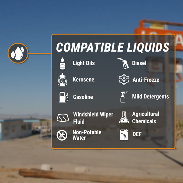 | Fluid Type | Gasoline/ Diesel/ DEF (AdBlue)/ Non-Potable Water/ Kerosene/ Antifreeze/ Windshield Washer Fluid |