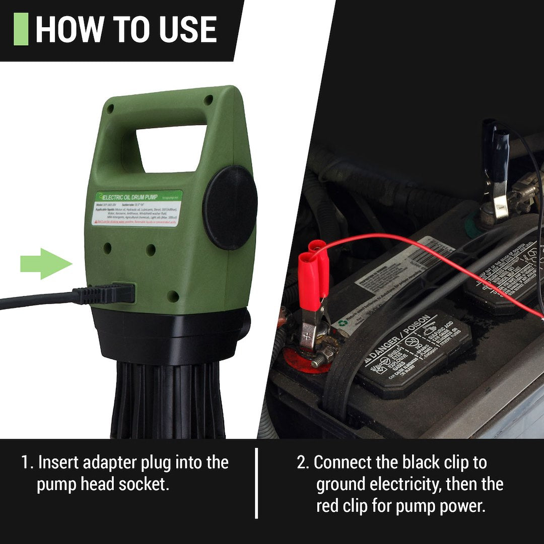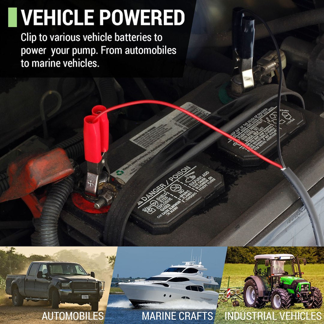 - Clips Onto Vehicle Batteries To Power Transfer Pump